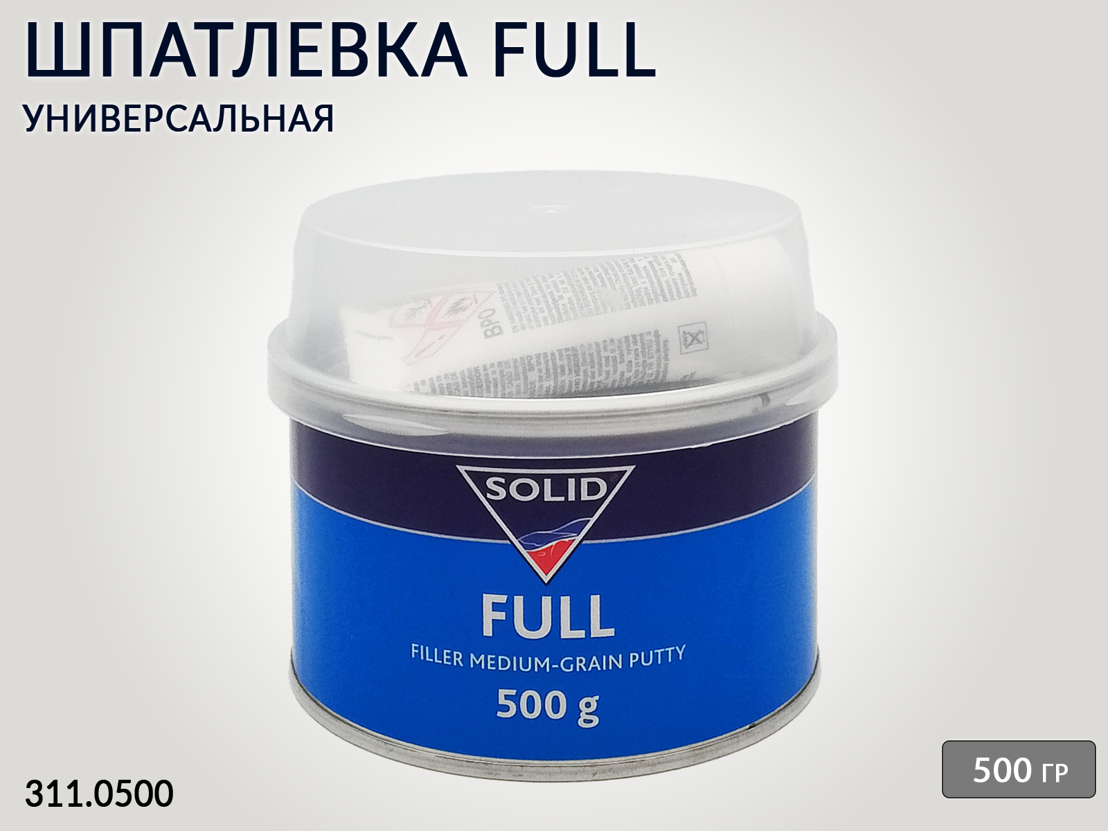 Полиэфирная среднезернистая шпатлевка FULL SOLID (311.0500) является универсальным в применении продуктом, легко шлифуется и комфортна в нанесении. Рекомендуется в качестве основной шпатлевки. Обладает высокой прочностью и хорошей наполняющей способностью.