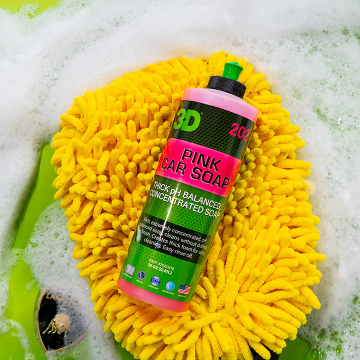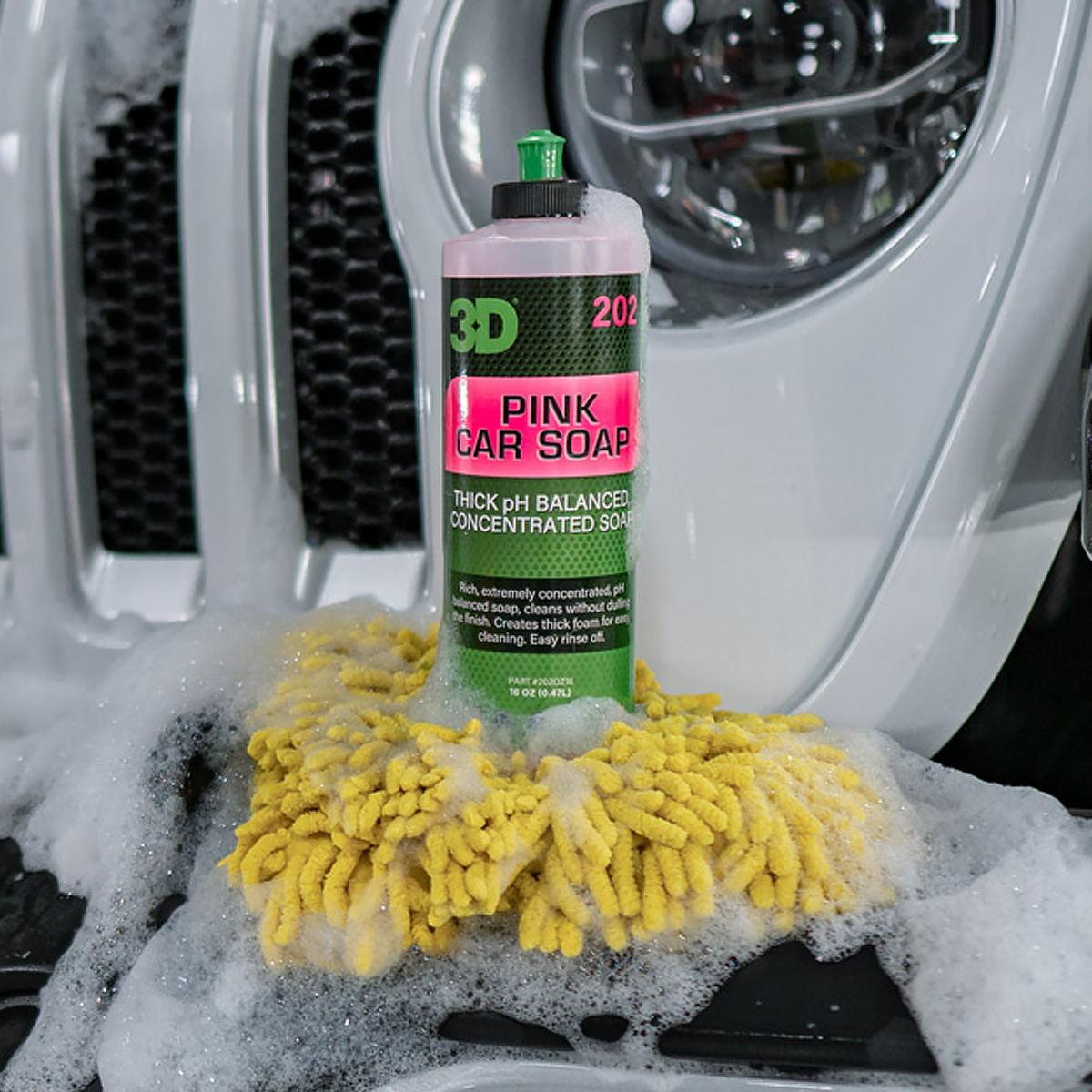 Концентрированный pH-сбалансированный шампунь Pink Car Soap 3D удаляет грязь, не повреждая восковое покрытие. Способствует образованию густой пены, которая легко справляется с грязью и дорожной пылью, при этом ЛКП автомобиля не тускнеет. Легко смывается и не оставляет следов. Может использоваться как для автоматической, так и ручной мойки. Безопасен для кожи. Безопасен для использования вместе с воском. Pink Car Soap обладает приятным ароматом и высокими очищающими способностями, а его рН-сбалансированная, биоразлагаемая формула, бережно очищает все окрашенные поверхности, резину, винил и пластмассовые детали экстерьера от въевшихся органических загрязнений, образующихся в результате эксплуатации автомобиля.