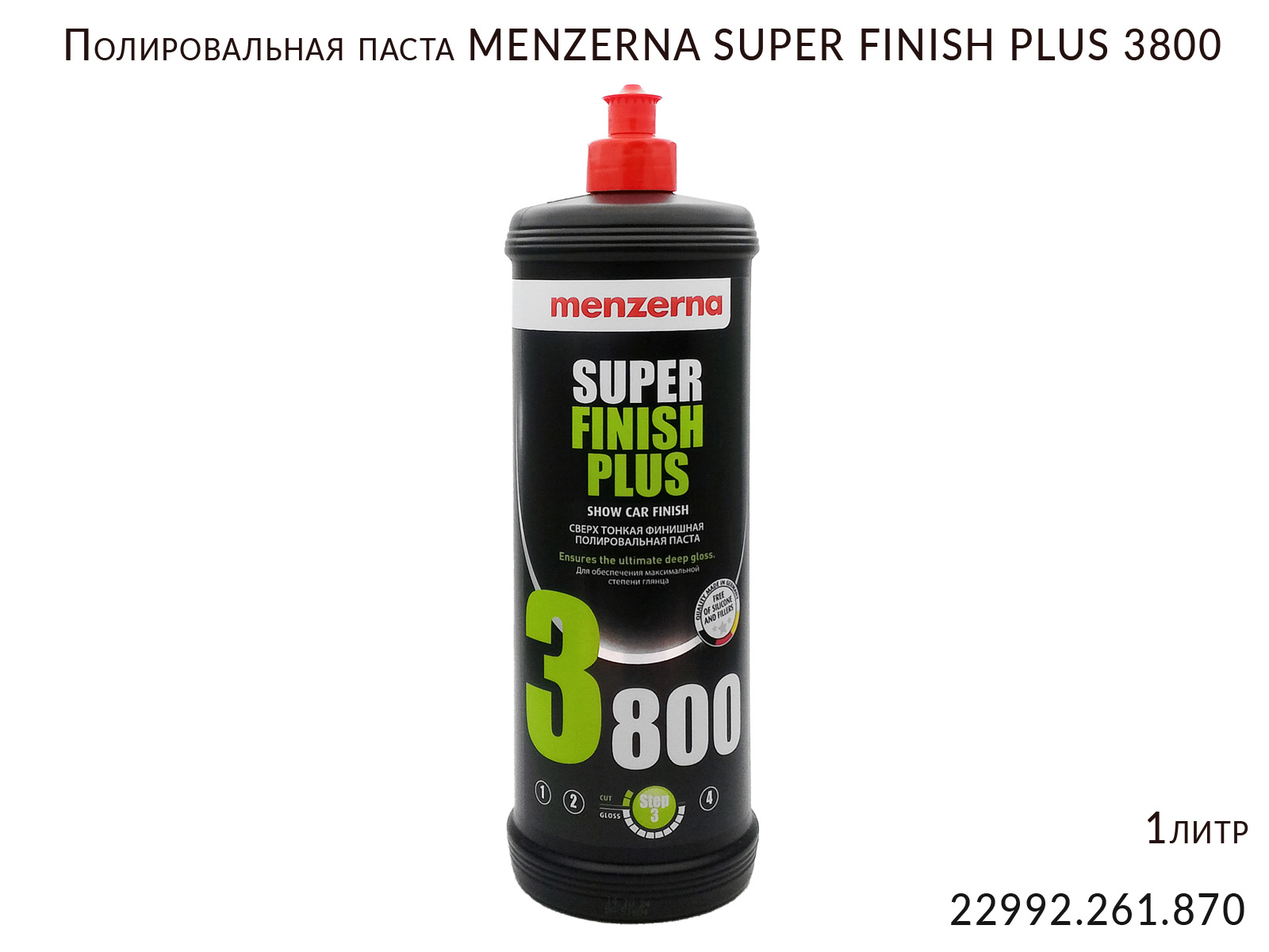 Полировальная паста SUPER FINISH PLUS 3800 MENZERNA (22992.261.870) это финишная антиголограммная паста, предназначенная для третьего этапа полировки, достижения идеального финишного блеска и удаления голограмм на свежеокрашенных и бывших в эксплуатации лакокрасочных покрытиях. Особенно актуальна для поверхностей темных цветов.