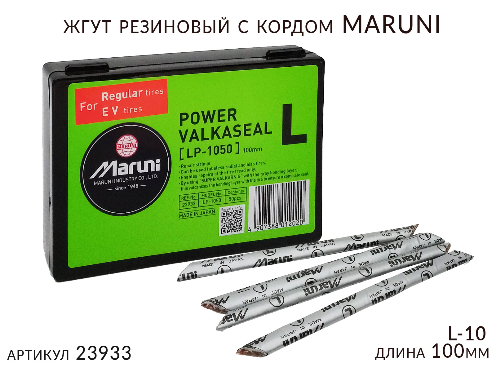 Усиленные жгуты Maruni L-10 (23933) являются наиболее совершенными армированными жгутами для ремонта проколов бескамерных шин в любой ремонтно-пригодной зоне шины. Уникальная конструкция жгута обеспечивает его наилучшую гибкость и эластичность при сохранении высокой прочности. Усиливающий корд распределен по всему сечению жгута и полностью пропитан резиной для обеспечения герметичности в любых условиях. Внешний вулканизирующий слой надежно вваривает жгут в шину, герметично заполняя все трещины. Данные жгуты используются и как заполняющий материал при комбинированных видах ремонта с применением кордовых заплат. Кордовые жгуты Maruni идеальны для быстрого и качественного восстановительного ремонта всех типов бескамерных шин.