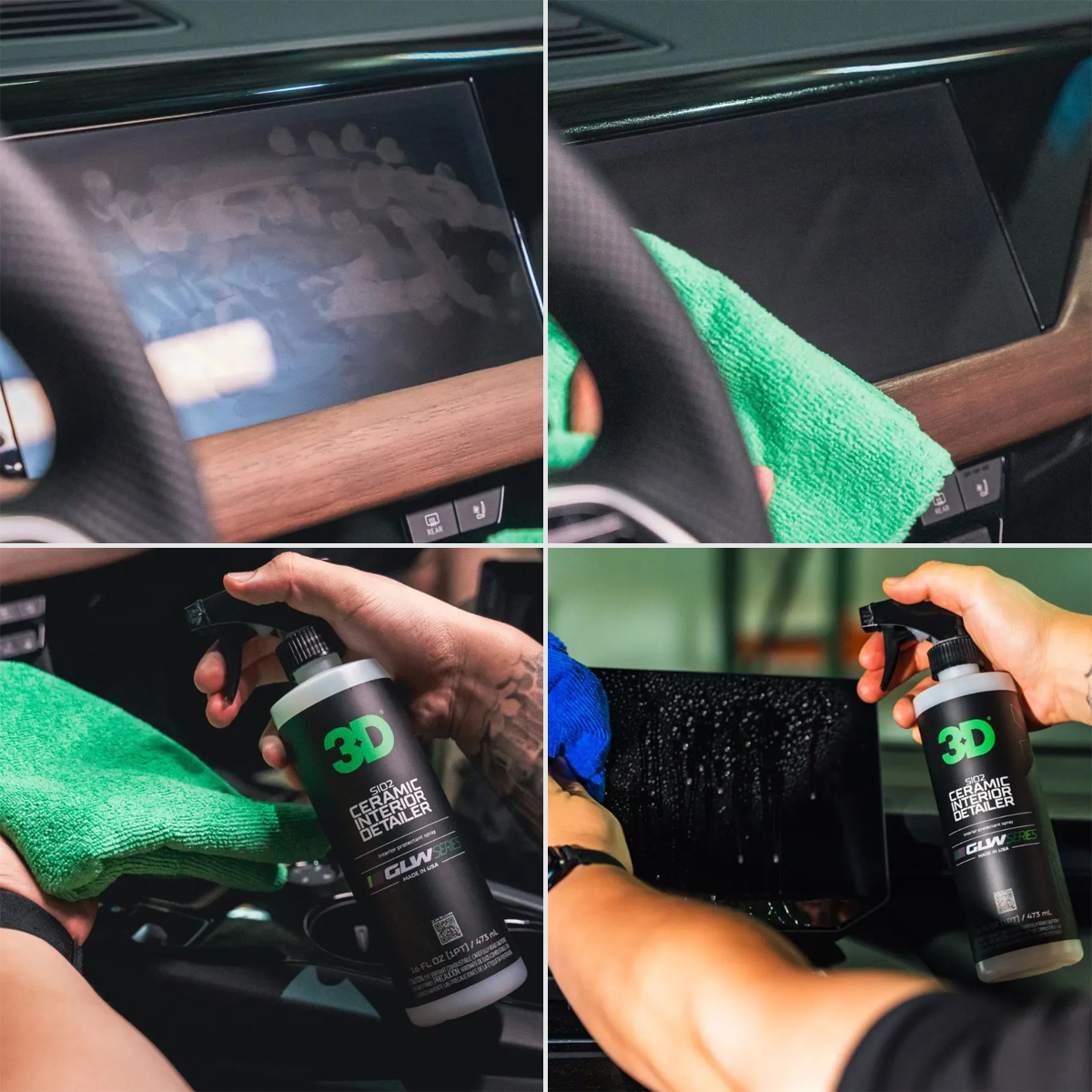 Керамическое средство для очистки салона 3D GLW Series SiO2 (347OZ16) безопасно и эффективно удаляет отпечатки пальцев, жир, загрязнения и пыль практически со всех поверхностей салона, одновременно создавая слой гидрофобной защиты, в состав которого входит SiO2, создающий прочное защитное покрытие. Благодаря нелипкой формуле очистка труднодоступных мест в салоне вашего автомобиля еще никогда не была такой простой. Состав Ceramic Interior Detailer легко и безопасно можно убрать загрязнения и оставить защитное покрытие на поверхности пластика, винила и искусственной кожи в салоне автомобиля. Очиститель 347OZ16 придает поверхностям глубокий, насыщенный, сдержанный вид. Удаляет отпечатки, жир, липкость и пыль на большинстве внутренних поверхностей, добавляя слой гидрофобной защиты от будущих разливов жидкости и прочих загрязнений. Отличные антистатические свойства уменьшают притяжение пыли, что упрощает очистку в будущем. Формула без липкости. Отлично подходит для регулярного ухода за интерьером.