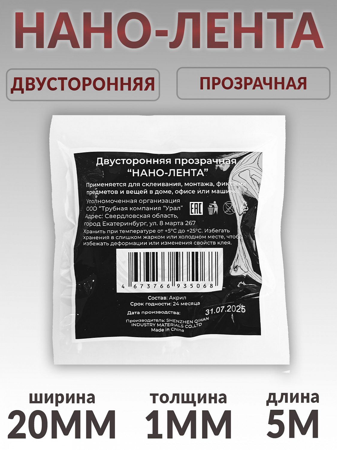 •Тип клея: акриловый, двусторонний.