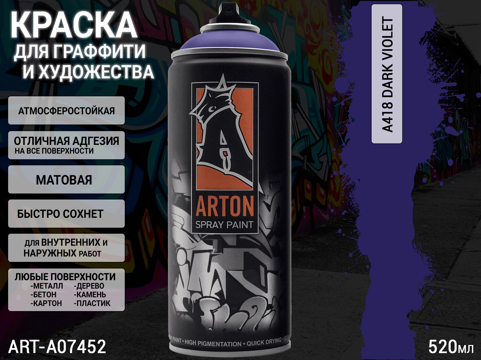 1. A418 темно-фиолетовый/Dark Violet краска для граффити аэрозоль ARTON (520мл)1