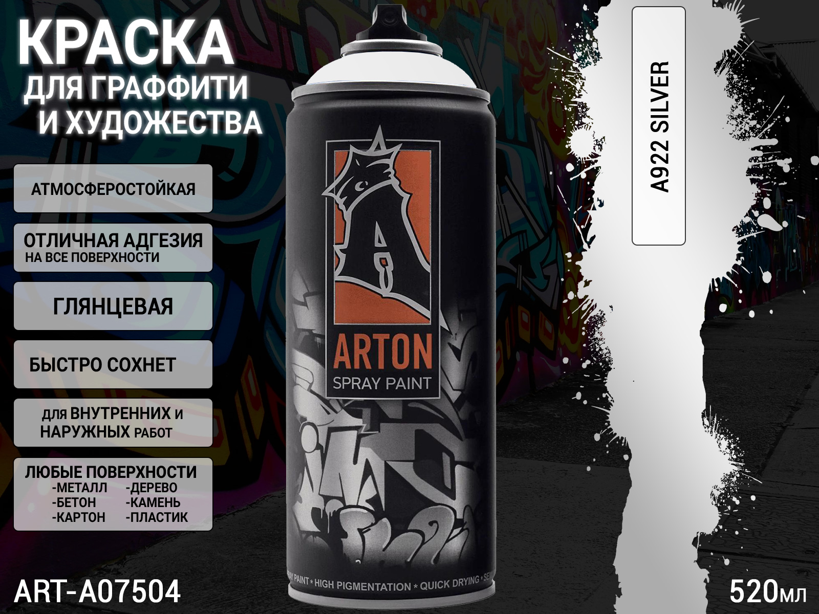 A922 серебро/SILVER краска для граффити аэрозоль ARTON (520мл)