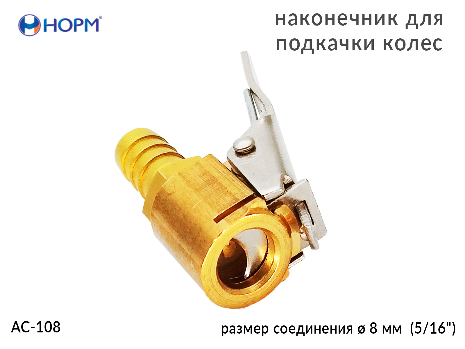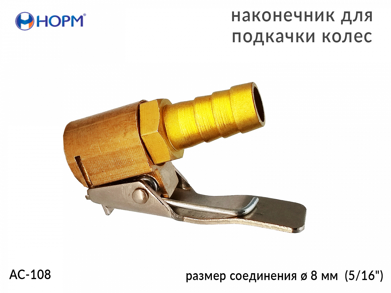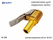 Наконечник для подкачки колес НОРМ (AC-108) устанавливается на конце воздушного шланга пистолета для подкачки колес, предназначен для жёсткой сцепки воздушного шланга и вентиля автомобильной покрышки. Переходник изготовлен из металла(латунь).