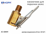 Наконечник для подкачки колес НОРМ (AC-108SM) устанавливается на конце воздушного шланга пистолета для подкачки колес, предназначен для жёсткой сцепки воздушного шланга и вентиля автомобильной покрышки. Переходник изготовлен из металла(латунь).