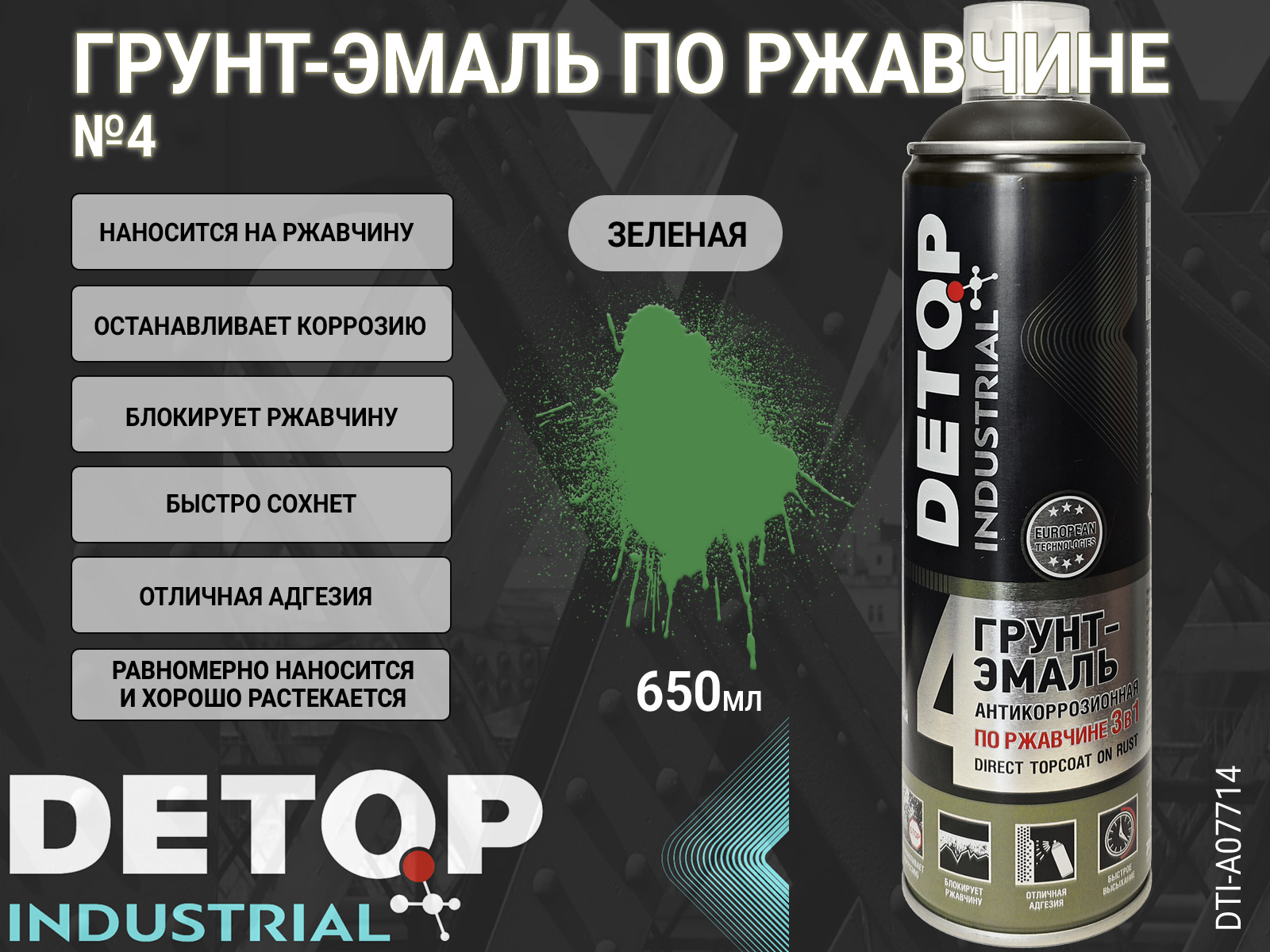 Аэрозольный грунт-эмаль №4 по ржавчине "3 в 1" DETOP INDUSTRIAL (DTI-A07714) выполняет функцию преобразователя ржавчины, антикоррозионного грунта и декоративной эмали. Применяется для покраски чугунных и стальных поверхностей с различной степенью коррозии: от следов коррозии до полностью покрытых ржавчиной, плотно сцепленной с металлом, толщиной до 70 мкм. Грунт-эмаль №4 предназначена для защиты металлических конструкций промышленного назначения, очистка которых затруднена. Используется для окраски поверхностей, подвергающихся атмосферному воздействию, в том числе промышленной атмосферы, содержащей агрессивные газы и пары, соли и другие химические реагенты, имеющие температуру не выше 60°С.