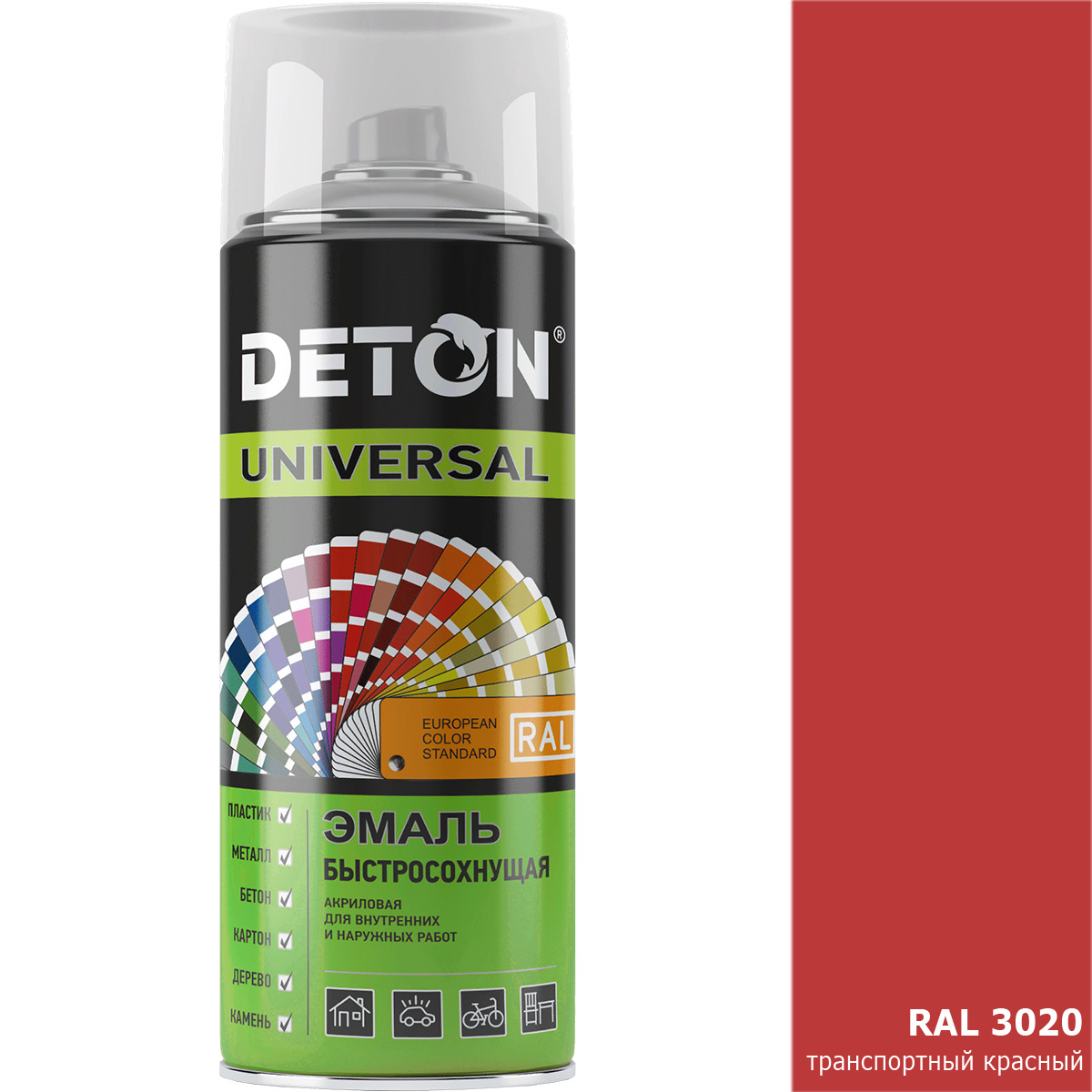 Эмаль-аэрозоль акриловая RAL 3020 транспортный красный DETON UNIVERSAL (520мл)