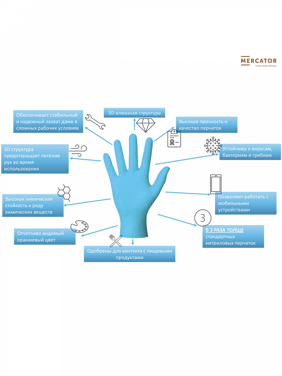 Специализированные защитные нитриловые перчатки GOGRIP от MERCATOR с толстыми стенками и алмазной структурой, обеспечивающие отличное сцепление и защиту при работе в масляной или влажной среде. Защитные, нестерильные перчатки имеют универсальную форму, подходит для правой и левой руки. Перчатки Gogrip синего цвета в 2 раза толще обычных нитриловых перчаток, при этом имеют высокую эластичность и стойкость к растяжению. Революционная трехмерная 3D алмазная структура поверхности: обеспечивает стабильный и надёжный захват даже в сложных средах, а также предотвращает потливость ладони во время использования.