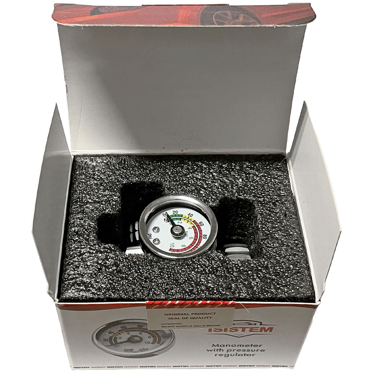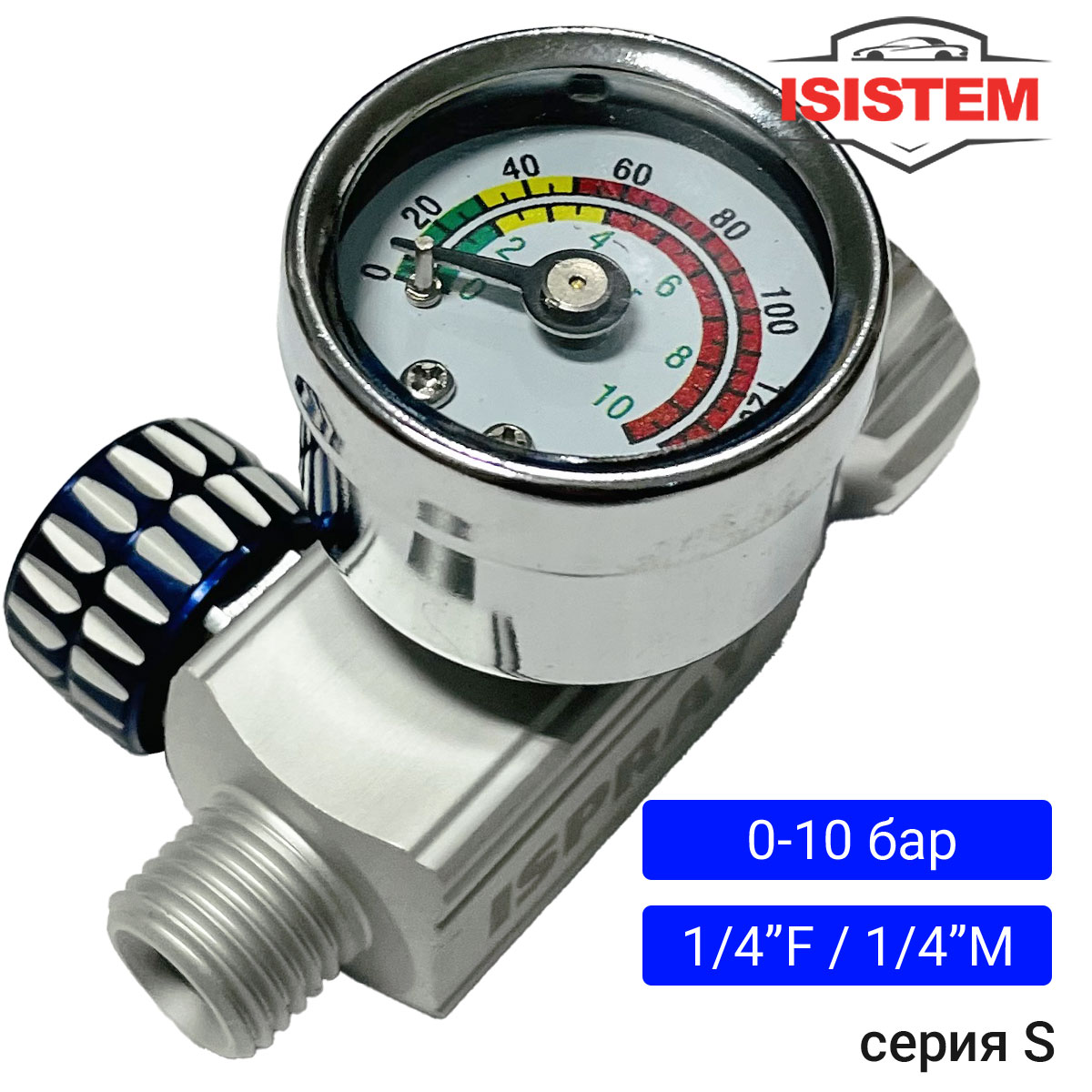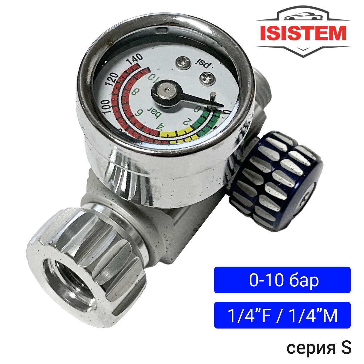 Манометр с регулятором давления "тип N" ISISTEM позволяет выставлять входное давление перед краскопультом. Крепиться непосредствено на gокрасочный пистолет с помощью резьбы 1/4F". Оборудование позволяет регулировать давление от 0 до 10 бар.