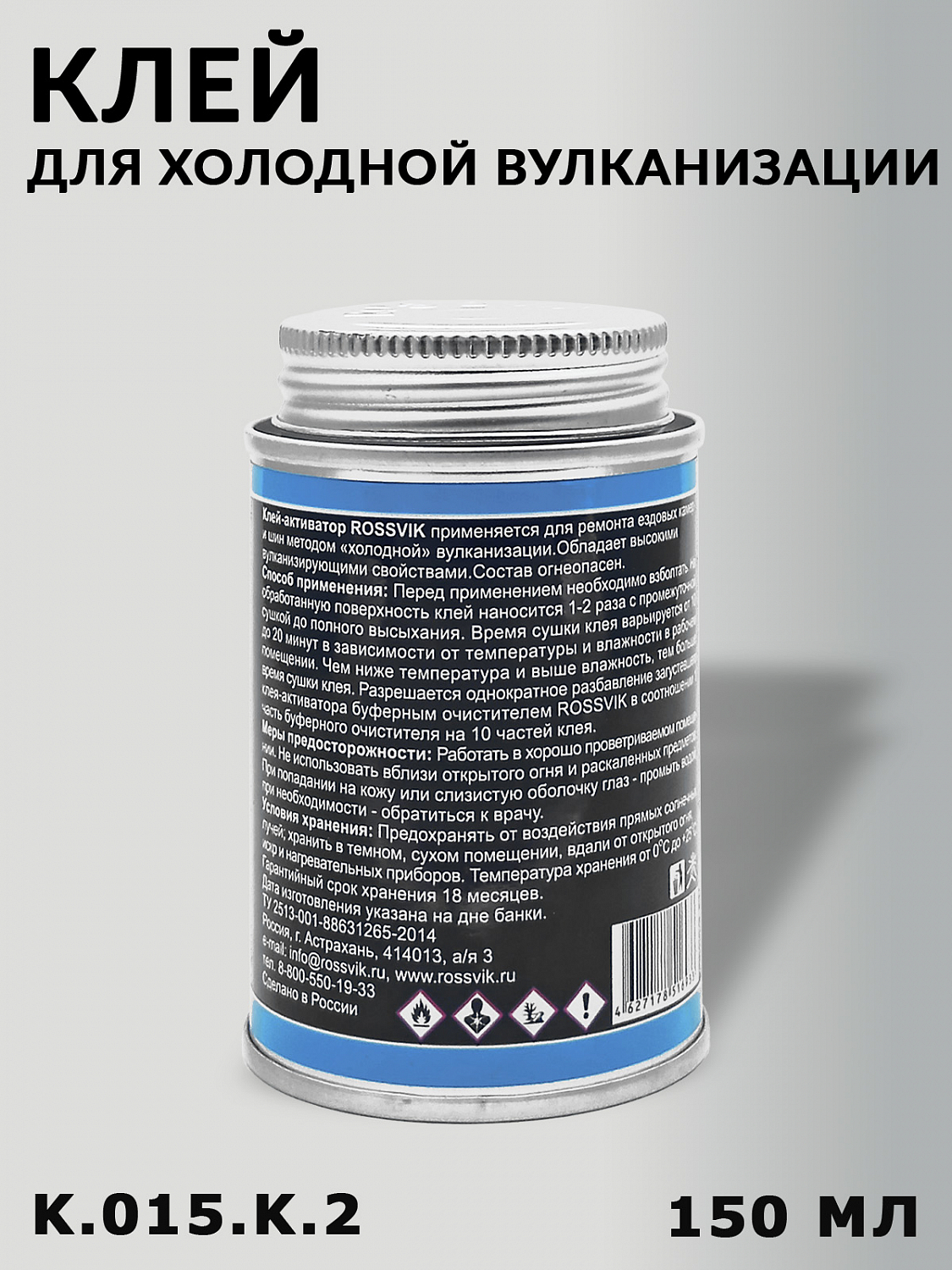 Клей для ХОЛОДНОЙ вулканизации ROSSVIK (K.015.K.2) – это универсальный клей-активатор, который эффективно применяется для восстановления повреждений с использованием латок, грибков, жгутов и кордовых пластырей методом "холодной" вулканизации.