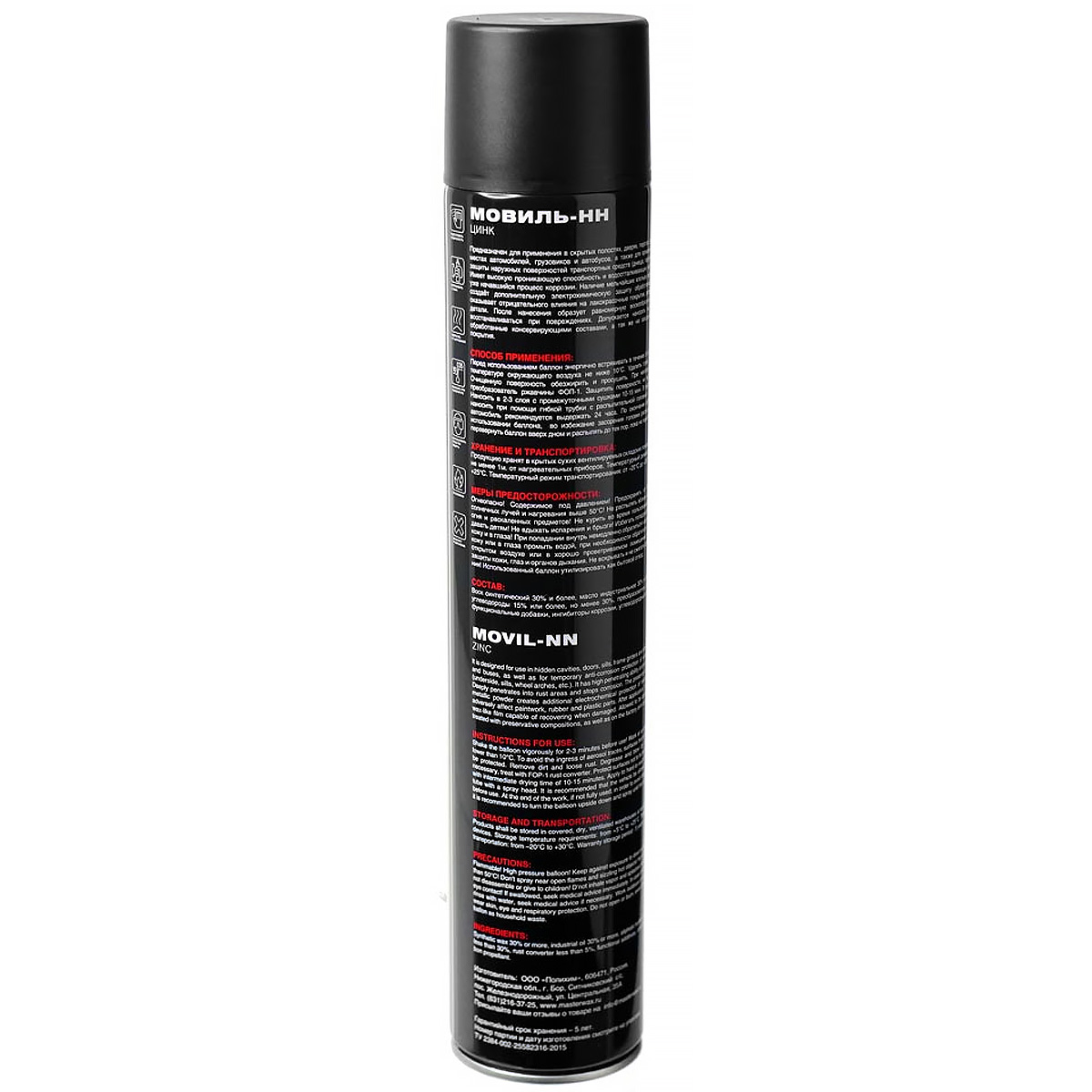 Мовиль ЦИНК MASTERWAX в аэрозоле - состав для эффективной антикоррозионной защиты скрытых участков кузова автомобиля: порогов, стоек, лонжеронов, дверей, багажника, подкапотного пространства, сварных швов и мест завальцовки. Обладает водовытесняющей способностью. Проникает в микротрещины. Содержит порошок активного металла, который создает дополнительную барьерную защиту. Рекомендуется для обработки всех видов транспортных средств, а также для консервации автотехники, инструмента и металлических деталей при транспортировке и длительном хранении.