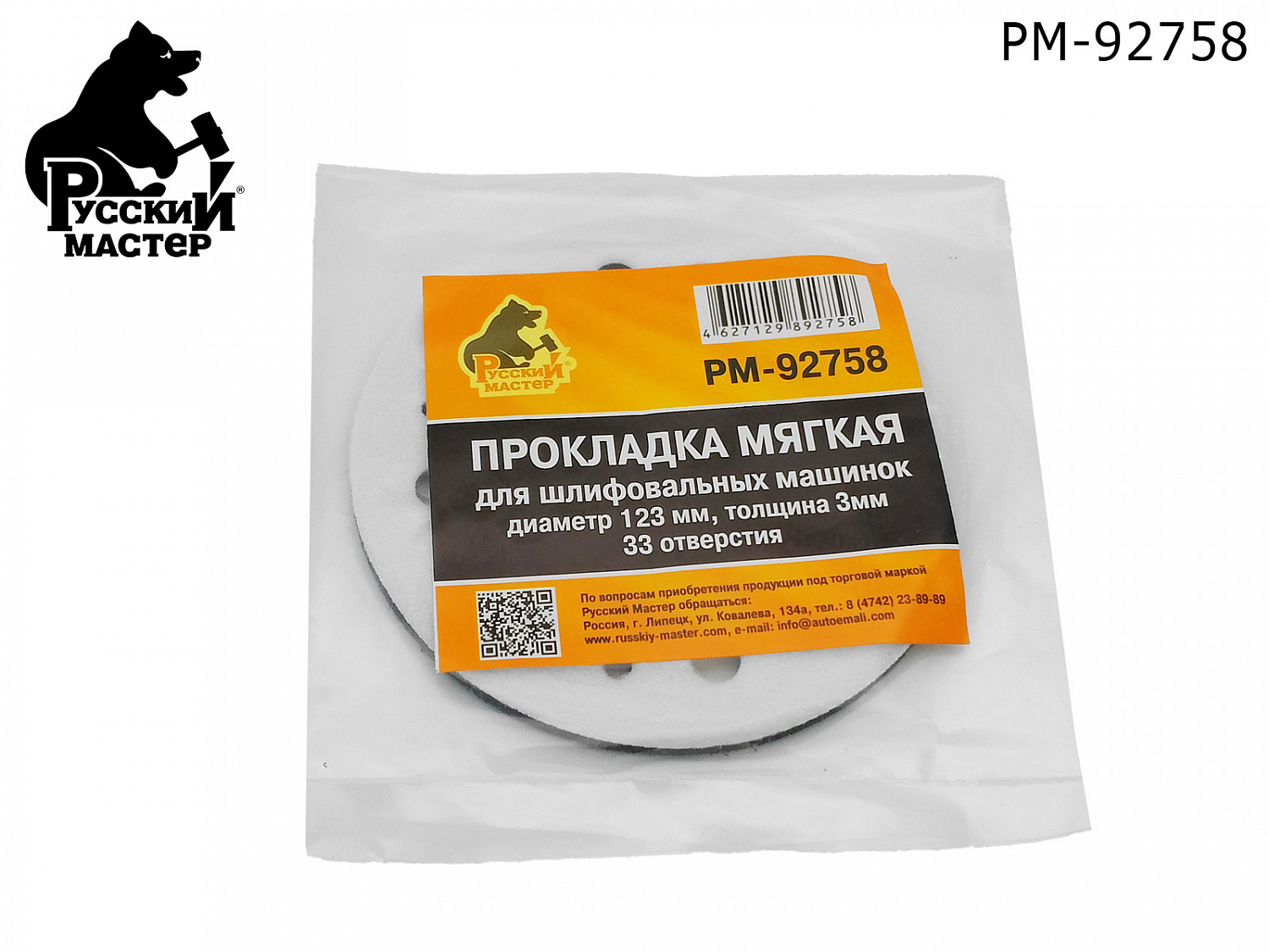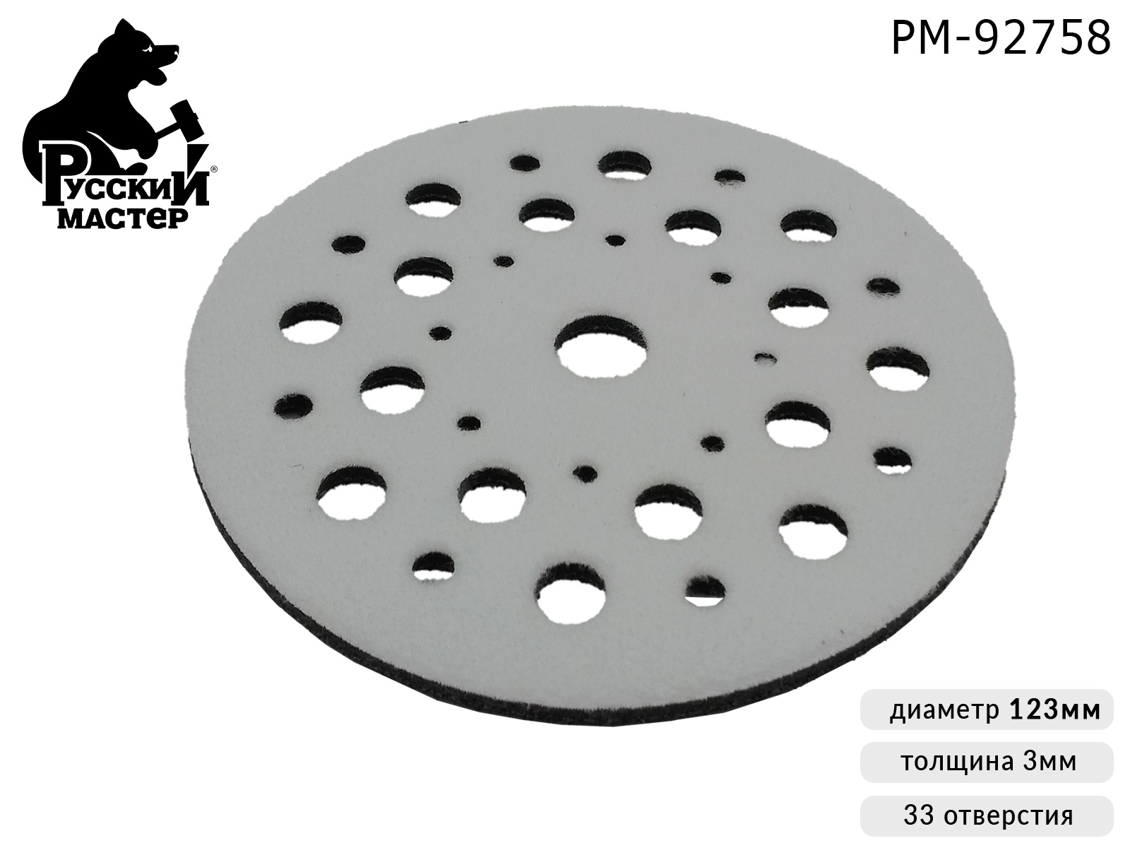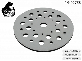 Защитная мягкая подложка для шлифовальных кругов РУССКИЙ МАСТЕР (PM-92758) диаметром 123мм предназначена для работы с абразивными кругами и совместима с большинством шлифмашин. 33 отверстия обеспечивают равномерное распределение нагрузки и надежную фиксацию круга.