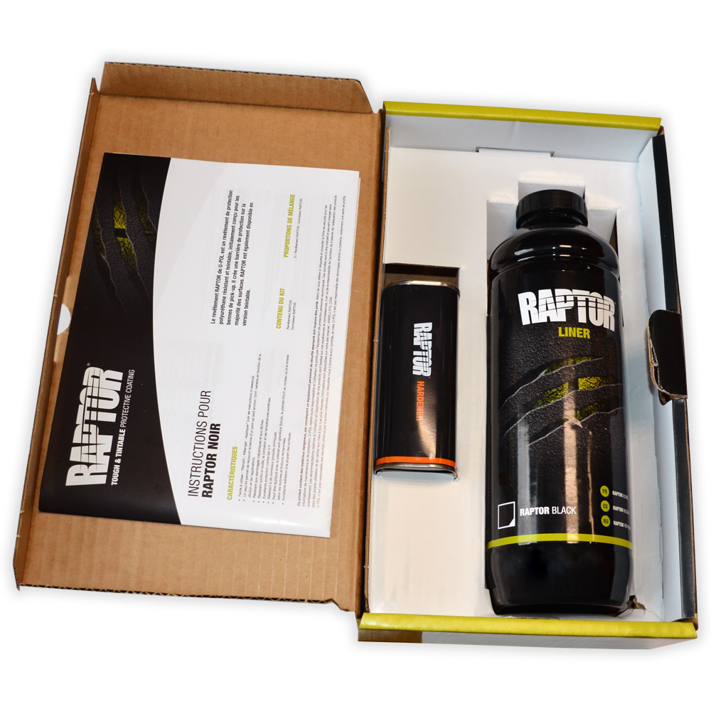 Новая, удобная упаковка черного раптора вместе с отвердителем и инструкцией.