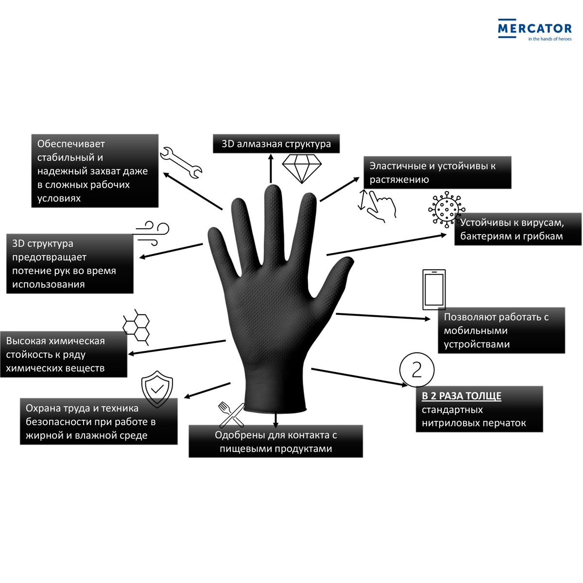 - Отчетливая нескользящая текстура с алмазной структурой увеличивает силу трения и обеспечивает стабильный захват, особенно в масляной и влажной среде.