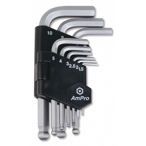 Набор шестигранников AMPRO T22927 предназначен для обслуживания шестигранных соединений. Г-образная форма с шаровым профилем ключа обеспечивает большой крутящий момент и удобство затягивания. Все инструменты набора изготовлены из хром-ванадиевой стали и упакованы в пластиковый корпус с маркировкой.