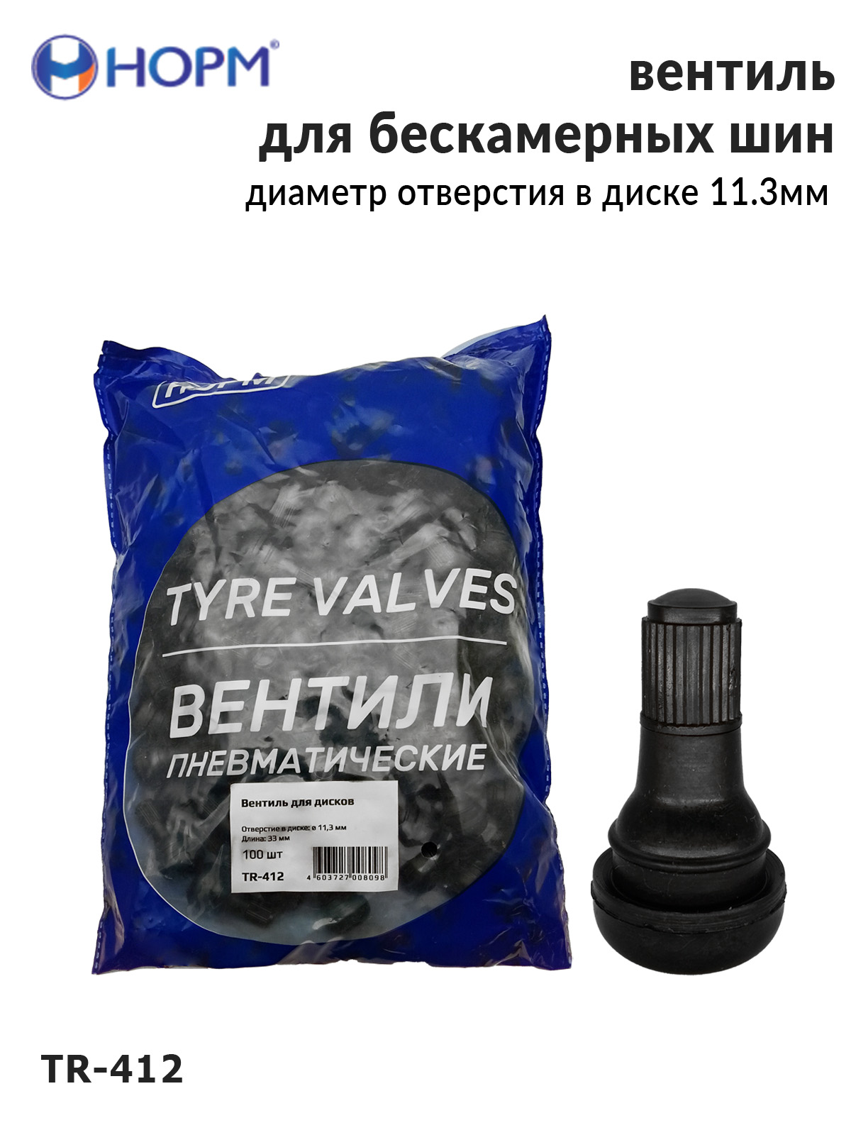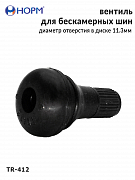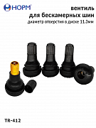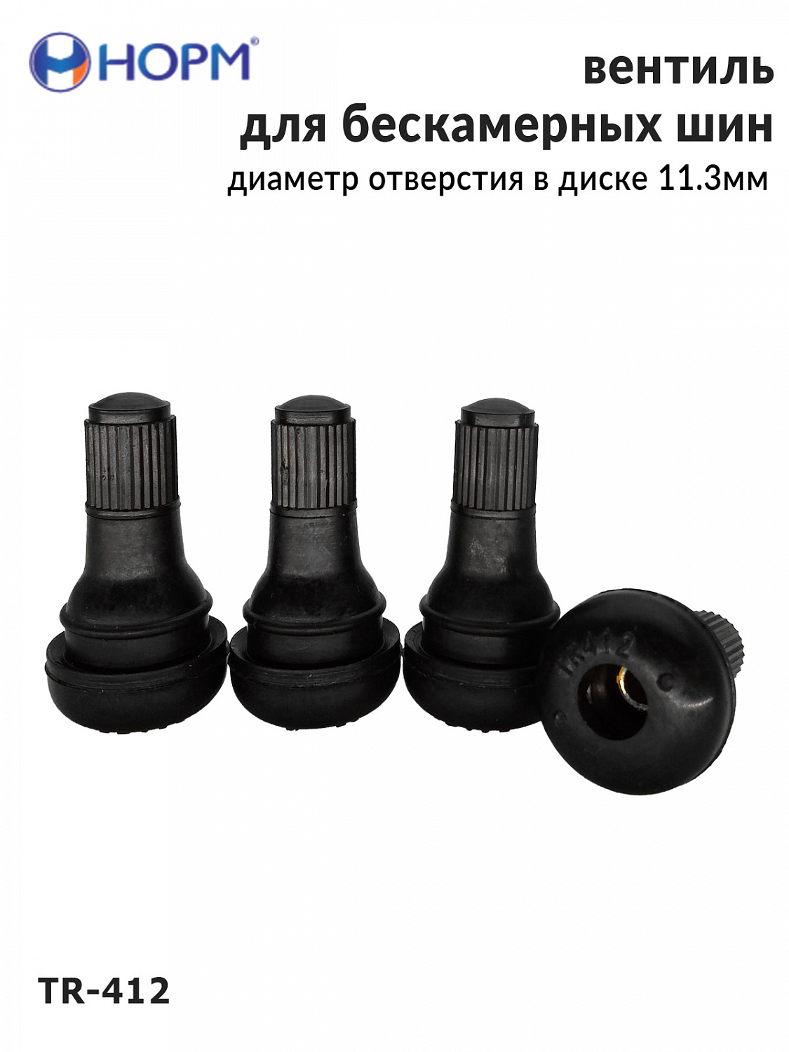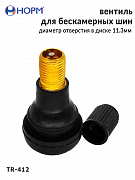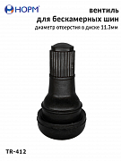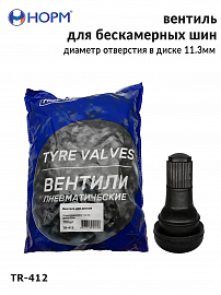 Резиновый универсальный вентиль НОРМ (TR412) устанавливается на любые бескамерные колеса легковых автомобилей, грузовых автомобилей малой грузоподъемности, прицепы и полуприцепы, спецтехнику с диаметром отверстия в диске 11,3мм специальным инструментом. Подходит для большинства литых и штампованных дисков.