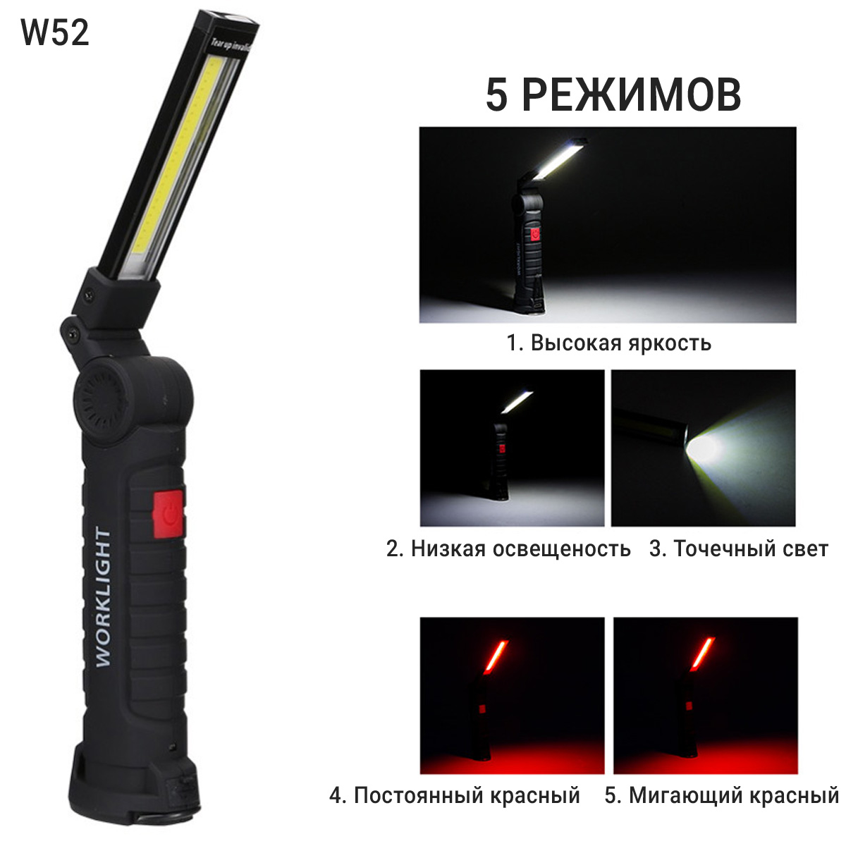 Переносной фонарь имеет 5 режима освещения: белый свет COB - яркий, средний и точечный LED (в торце лампы); красный - постоянный и мигающий (для включения необходимо удерживать кнопку питания 2 сек).