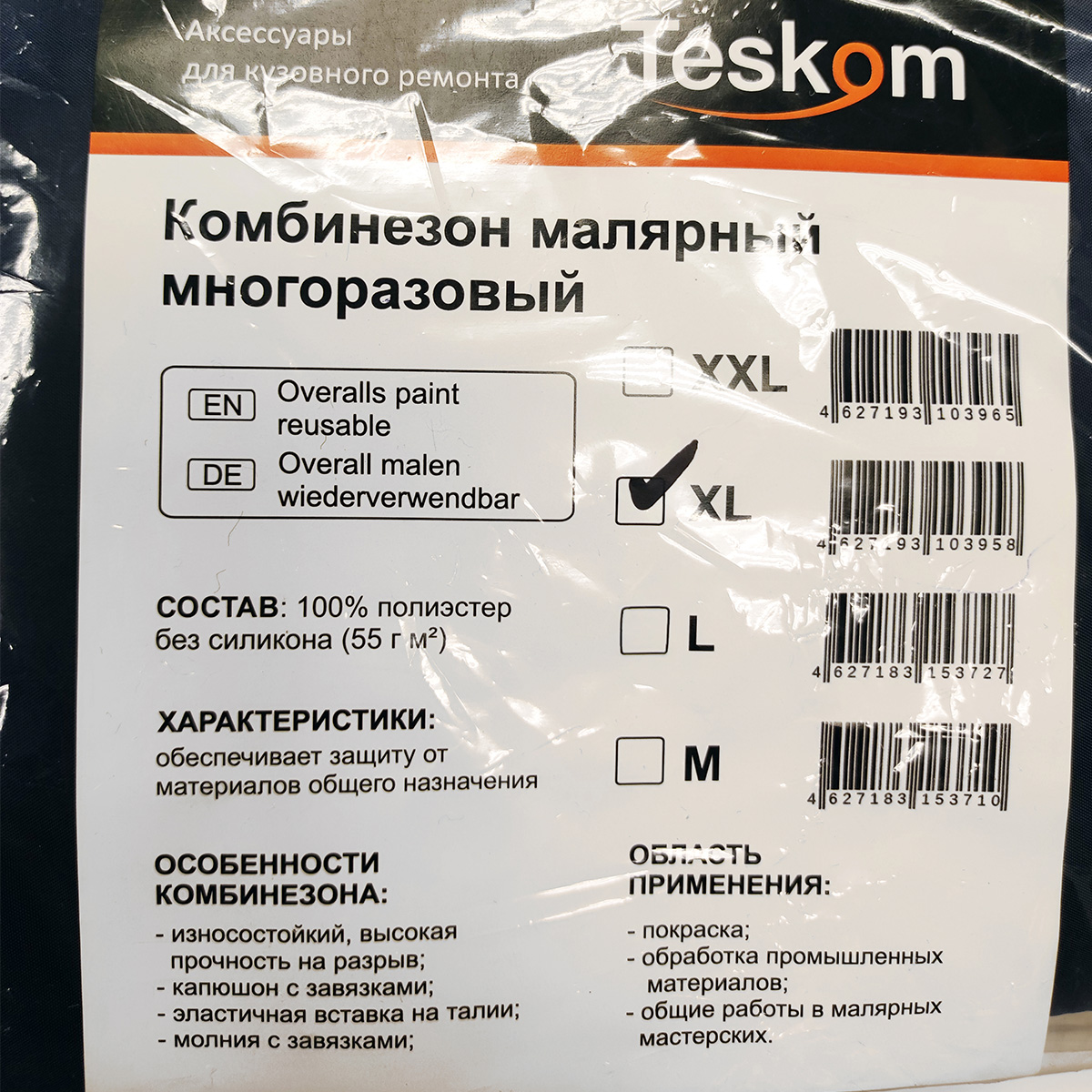 Многоразовый малярный комбинезон с капюшоном TESKOM используется в качестве защитной спецодежды при кузовных и покрасочных работах и т.п. Может использоваться при работе с красками и лаками, смазочными материалами, полиуретановой пеной.